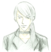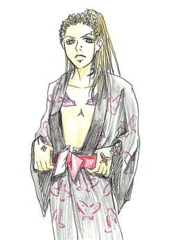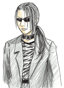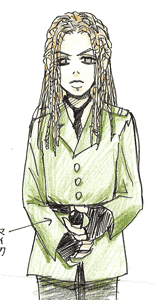 HAKUEI:カーキのミリタリーの下に裸黒ネクタイ。黒の革手袋、アイパッチ。下はやぶれ黒パンツ。